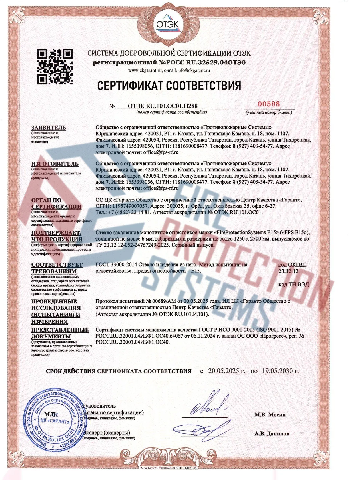 Класс огнестойкости: E 15 — сохраняет целостность при огневом воздействии в течение 15 минут.